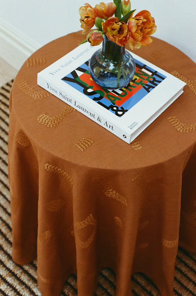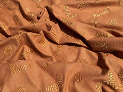 Featured here in embroidered Raphia fabric in Tobacco, made with 100% cotton.