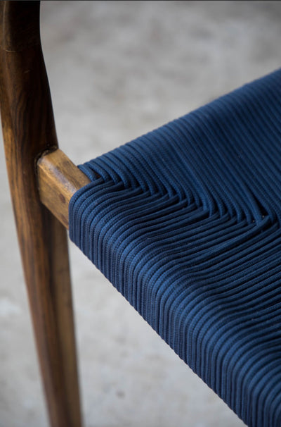 Part of the 2021 Collection, Navy Chair from Daniel Orozco Estudio is crafted from solid Jabin wood with a natural finish and features handwoven wicker in a blue hue. Handworked by Mexican artisans, the Yucatan wood adds a touch of natural beauty to the piece. Explore the natural allure of materials with this intricately woven and handcrafted chair.