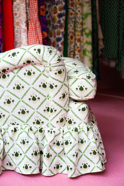 The Sofia here features our embroidered Raphia fabric in Powder, made with 100% cotton.