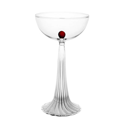 The NEREIDA coupes reference an enchanting mythological undersea world. The highly sculptural design holds a colored glass sphere, as a precious pearl. Each piece is handmade in Italy by master glassblowers using high-quality borosilicate glass.