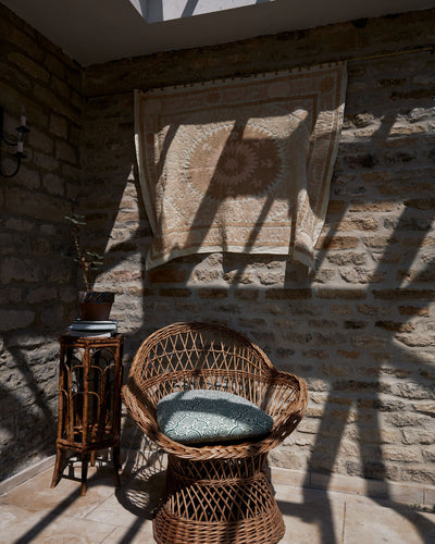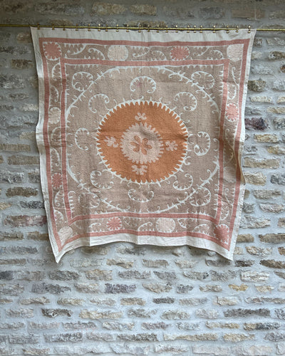 This exquisite handmade Suzani, carefully sourced by Chloe from Asia, boasts a captivating muted colour palette and a floral motif that will add richness and depth to any interior.