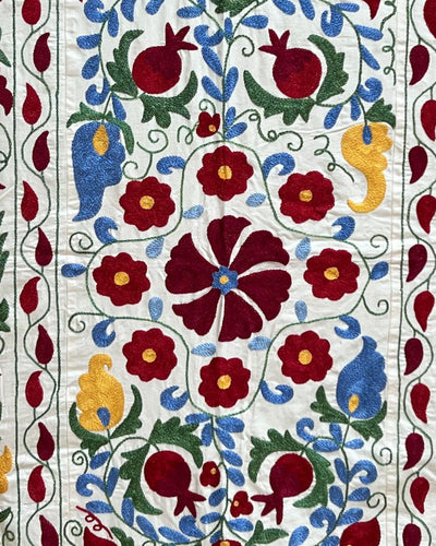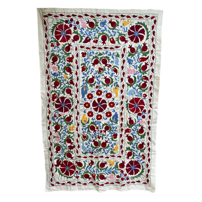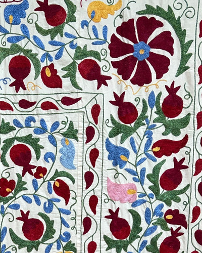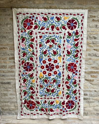 This Suzani has a rich history that is believed to be over 20 years, it is likely to carry endearing marks of time, such imperfections only enhance its unique character and add to it's charm.