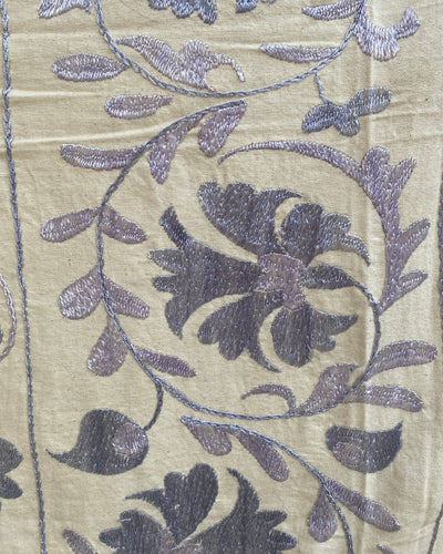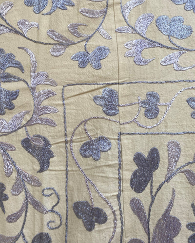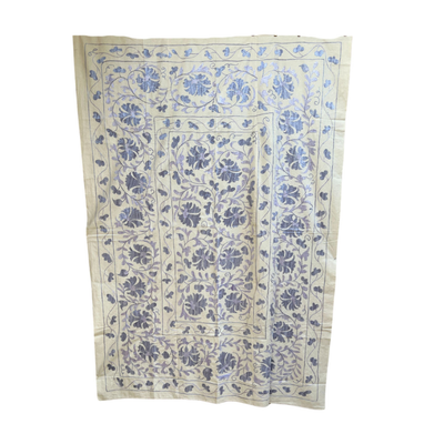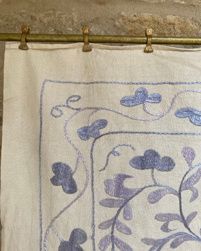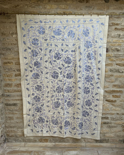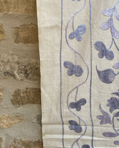 An exquisite hand-embroidered light blue and light lilac vintage textile panel, that has been chosen by Chloe from Asia. This handmade vintage Suzani, is a true masterpiece that will effortlessly infuse colour and pattern into any interior.