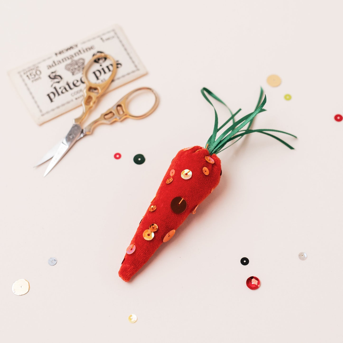 This gorgeous garden-inspired carrot ornament twinkles on the tree with hand-sewn sequins adorning its velvet orange body and green ribbon-topped stem. A gardener's delight!