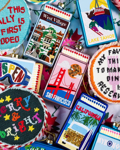 Wanderlust for your tree. Iconic hot spots from dreamy destinations reimagined in charming glass keepsake Christmas tree ornaments.  Take your holiday decor from trad to rad with Furbish's curated assortment of festive AF needlepoint pillows, ornaments, tree toppers, stockings, and tree skirts.