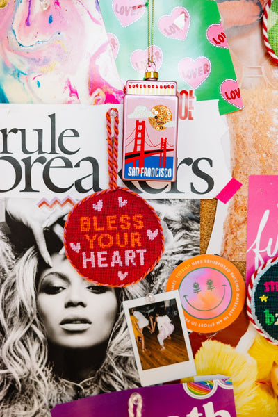 Make a statement with this sugary-sweet southern saying needlepoint ornament on your tree. Backed in luxe velvet, Furbish revived this Southern staple with sayings that are sure to get a smile.  Take your holiday decor from trad to rad with Furbish's curated assortment of festive needlepoint pillows, ornaments, tree toppers, stockings, and tree skirts.