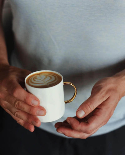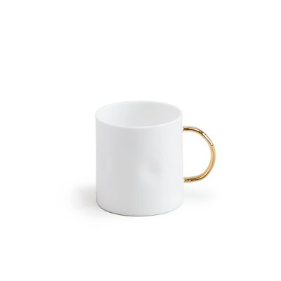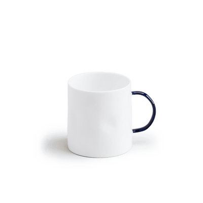 Our original mug. The mug launched from (what felt like) a thousand prototypes. Holds a flat white, cappuccino or herbal tea very happily. Handmade from fine bone china, with a transparent glaze that brings out the crisp white of the material and emphasises its dimpled profile. Hands aren't perfectly cylindrical, and neither are our mugs. With a hand-painted handle in either Cobalt, Geranium Red or 24ct Gold. You can also find sets of four coffee mugs here.
