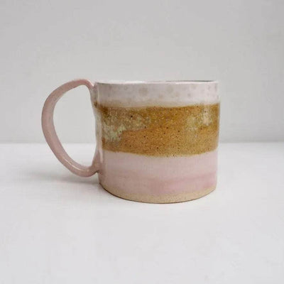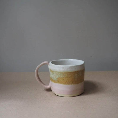 Handmade ceramic mug glazed in stripes of cream, pink and textural mustard  gloss glaze that gently merge in to one another.