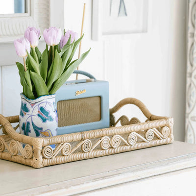 The Ivy Rattan Tray fits a dinner plate and two glasses comfortably. This large rectangular tray has two handles on either side for practicality when using it as a serving tray.