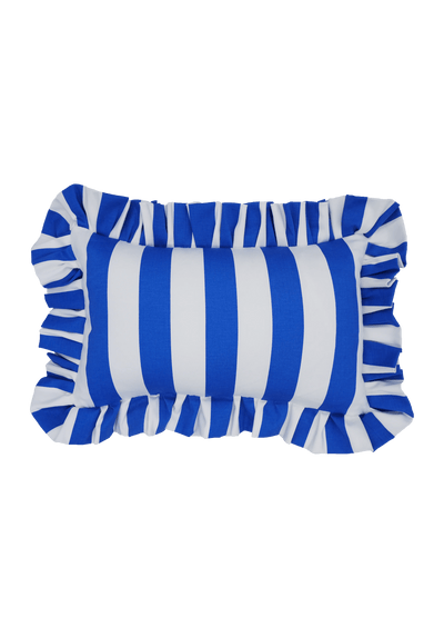 Blue and white Stripe cushion with ruffle detailing. Dry clean only.