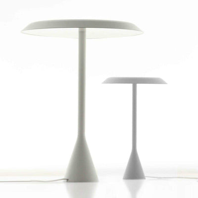 Family of table lamps in two sizes Panama and Panama Mini, with LED sources for diffused lighting. Made of aluminium, they are equipped with a polycarbonate reflector with anti-glare treatment and are therefore suitable for both domestic and work environments. Available in matt white or black embossed painted finishes. The mini version is also available in a cordless rechargeable battery version. Duration: 10 hours, recharge: 6 hours.