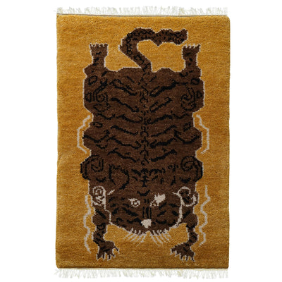 Le Tibetan is inspired by the iconic Tibetan tiger motif and hand-knotted in a rich palette of golden ochre, deep brown, black, and white. Made from 100% wool with a low pile. As each piece is handmade, slight variations in color and scale are natural.