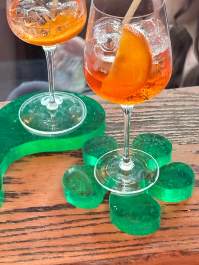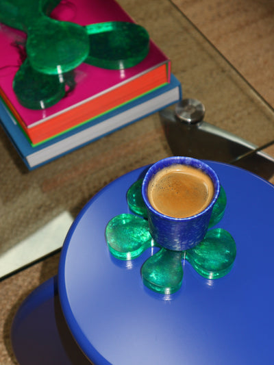 This limited edition version of the best selling Fleur Objet coaster swaps cork for Polygood®, a sustainable surface material made from 100% recycled plastic, including old CD cases and other post-consumer plastic to create the translucent green crystalline base.