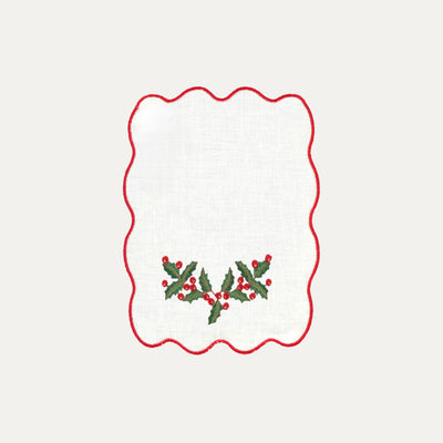 Cocktail napkins in a linen and cotton blend, with a wavy border and Christmas embroidery in different motifs. An elegant and functional detail, ideal for complementing festive tables or serving drinks and appetizers during the Christmas season.
