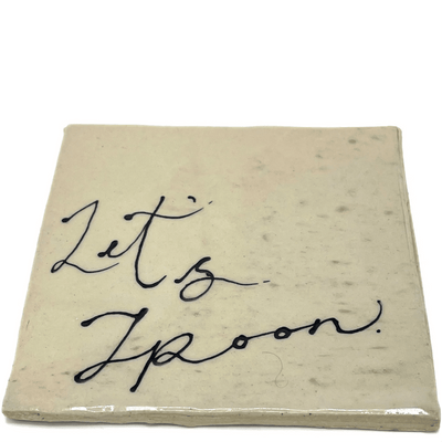 The Let's Spoon Coaster from L&Clay Ceramics features black underglaze text that reads: "Let's Spoon".