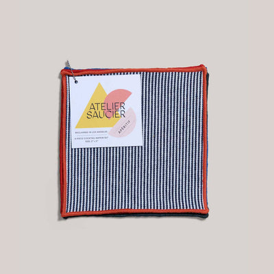 Confident colors meet classic stripes. A rainbow of red, orange, green, and blue trimming create a stately, yet playful cocktail napkin set.