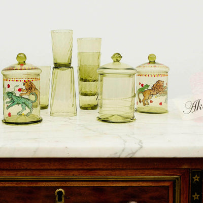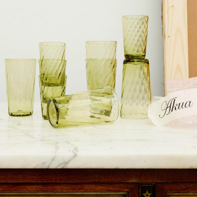 The colour of the glass is called Forest Green, and the shape and thickness of the glasses draws inspiration from the traditional Japanese serving glass.