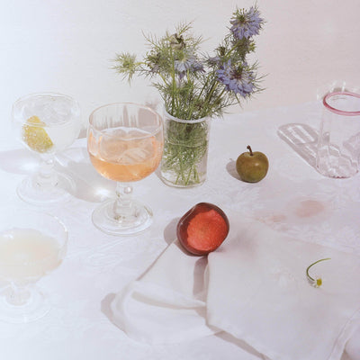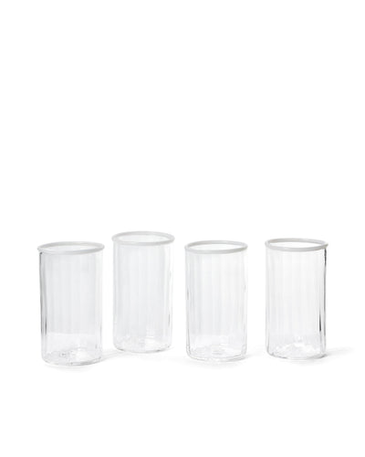 A light and elegant glass with a ribbed effect that works wonders with candlelights on a table. A lovely frame for the simplest of servings, water.