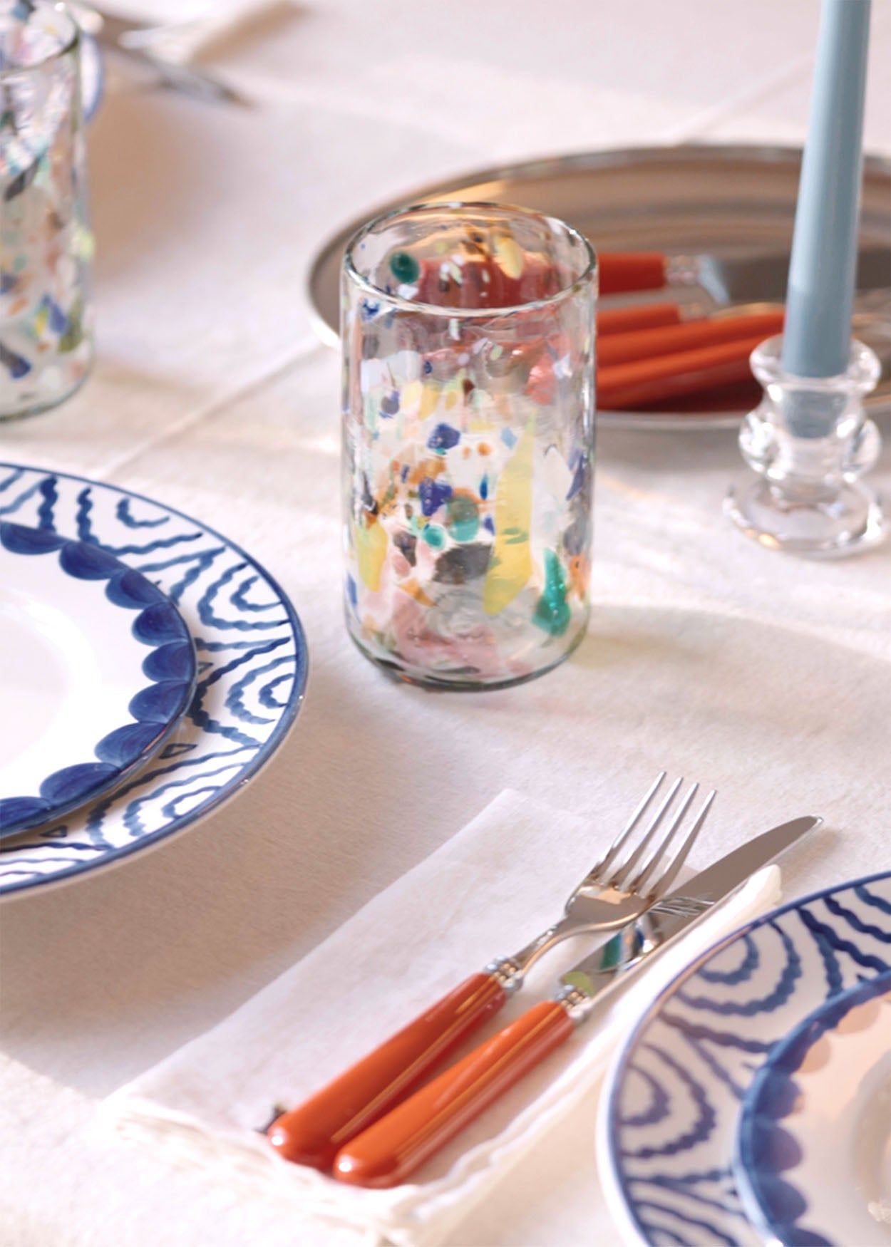 Extra tall, mouth-blown multicolour terrazzo tumblers from the beautiful Balearic Islands.