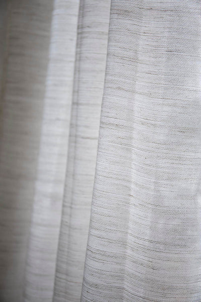 Wide linen curtain woven with thick threads that give a beautiful structure and heavy drape. The curtain is semi-transparent and filters the light beautifully. Tailored with invisible side hems, curtain tape at top and double fold at bottom. 18 pcs of 4-finger hooks are included. The drape is 295 cm wide, when pleated with the included hooks, the width is approximately 150 cm.