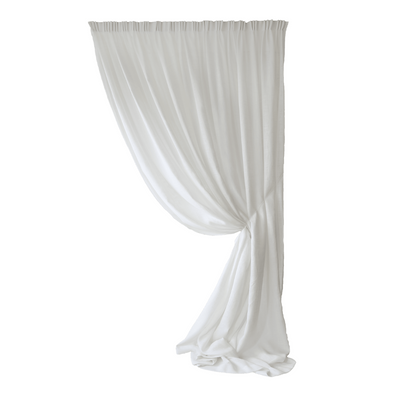 The drape is 295 cm wide, when pleated with the included hooks, the width is approximately 150 cm.