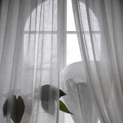 Wide linen curtain woven with thick threads that give a beautiful structure and heavy drape. The curtain is semi-transparent and filters the light beautifully.  Tailored with invisible side hems, curtain tape at top and double fold at bottom. 18 pcs of 4-finger hooks are included.