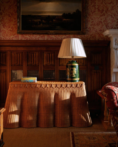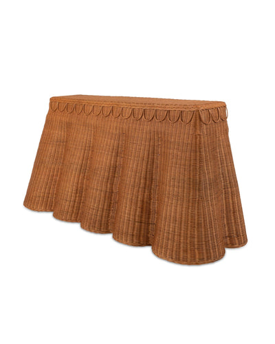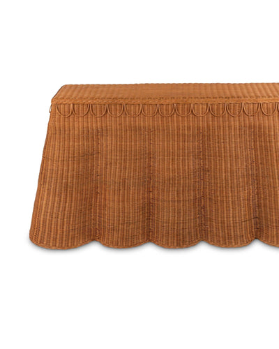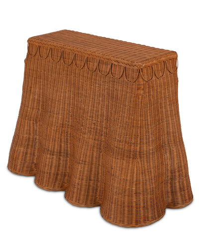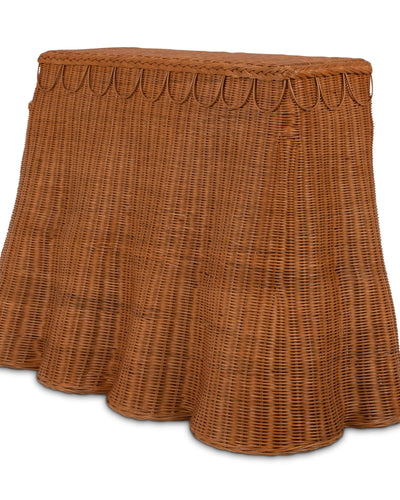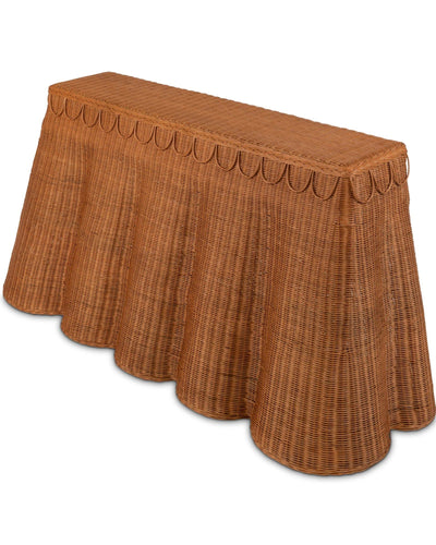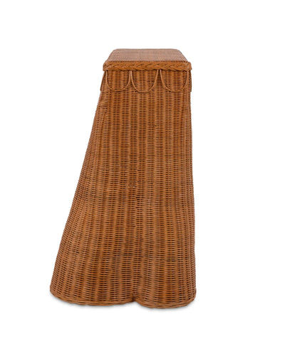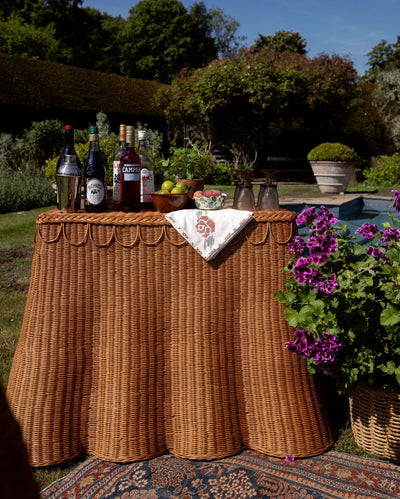 Featuring Sharland England’s signature braiding and loops, the Adeline console table is sophisticated and yet still cosy. Handwoven curves flare out at the base like a tablecloth inspired by vintage rattan furniture showcasing a technique named trompe l’oeil drapery, giving the silhouette a very feminine, elegant feel. The back is straight to sit flush against a wall or back of the sofa.