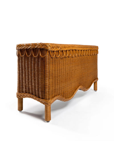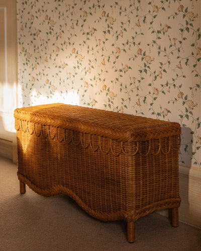 Hand-crafted from 100% natural rattan, the Bunny bench sits neatly at the foot of a bed, adjacent to the base of stairs, by the front door (perfect for putting on shoes), plus it also looks fabulous as a mini coffee table. Sharland England’s signature braiding and loops run around the rim, and a scalloped hem makes the wicker feel like a beautifully draped tablecloth.