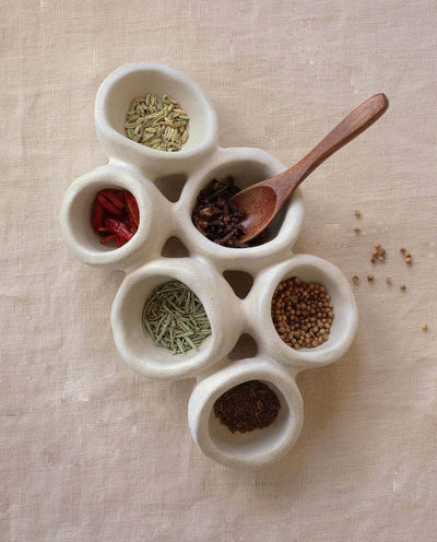 The 'Organic Fusion N°1' plate is a versatile and functional piece that goes beyond traditional tableware. It features several small plates or bowls seamlessly attached during production. This innovative design allows for various uses, whether serving food, storing jewellery, presenting spices or eggs, or even as a trinket bowl.