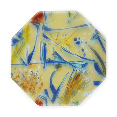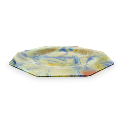 The octagonal shape is asymmetrical with a larger brim for a secure grip. The hollow base is off-centre for perfect balance. The crystal-clear material used, methacrylate, is fused together with printed and gold hand-painted polyester organza, thermo-formed and finished by hand.  Food-certified, impact resistant, dishwasher safe, stackable, handy and of great impact.