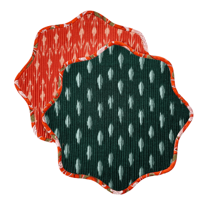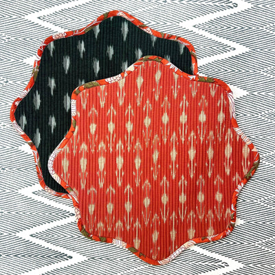 These are a development Table Love's The Breakfast placemat that quickly became a staple product. Getting the scallop & quilting flawless is the skilled craft of Table Love's Artisan makers. These placemats are two sided, quilted, reversible & each side has a bold IKAT pattern and the scallop is a contrasting floral. They are truly a labour of love: Two fun & bold woven Ikat fabrics (woven in Southern India) are then sandwiched and quilted vertically by hand, finished off and framed with a colourful border.