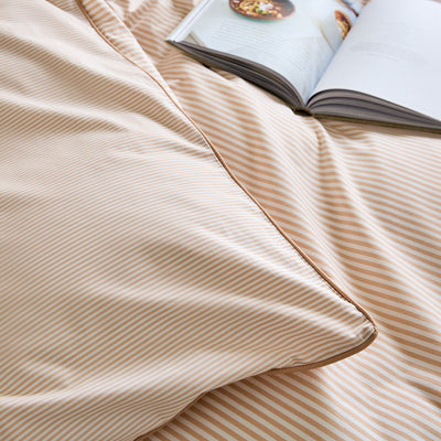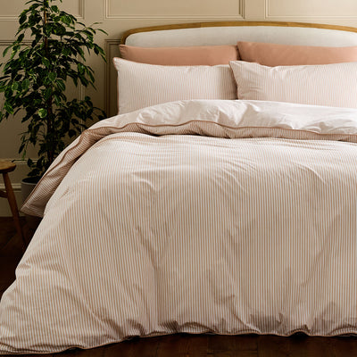 Choose which side of this reversible striped set you have on show, or even mix it up every day! Designed to pair perfectly with our plain bedding styles in the same shade. Slow-made from the highest quality, long-staple organic cotton threads to form our relaxed cool & crisp striped weave & finished with a beautiful, soft piped edge. Enjoy oh so comfortable bedding that makes for the perfect night's sleep. All sets include 1 x Duvet Cover & Pair of Pillowcases Single (135 x 200cm)Double (200 x 200cm)King (230 x 220cm)Superking (260 x 220cm)