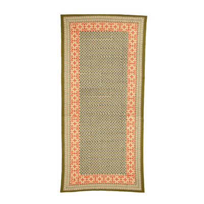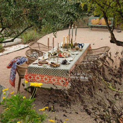 Introducing the Faina Table Throw, a large and beautifully hand-printed tablecloth perfect for bigger tables, measuring 160 x 350 x 0.20 cm. Made using traditional wooden block printing techniques, this versatile piece serves as both a functional tablecloth and a decorative addition to any dining setting, be it indoors or outdoors.