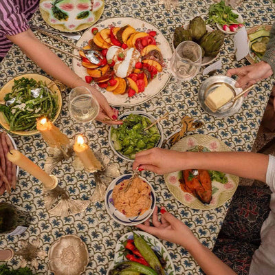 It brings a touch of cool-toned sophistication, suitable for stylish dining and outdoor events. For added convenience, it comes with a matching tote bag. Crafted in India from 100% cotton, the Faina Table Throw is a testament to artisanal skill. Its unique, cool-toned pattern not only functions as a practical tablecloth but also adds a modern flair to your dining space, making everyday meals feel special.