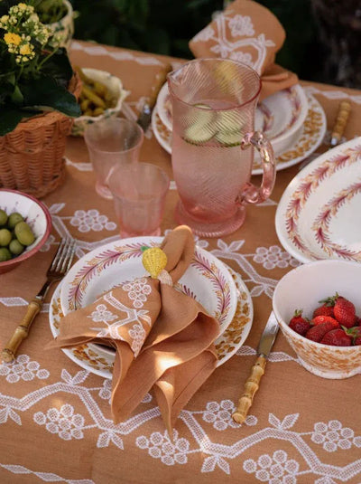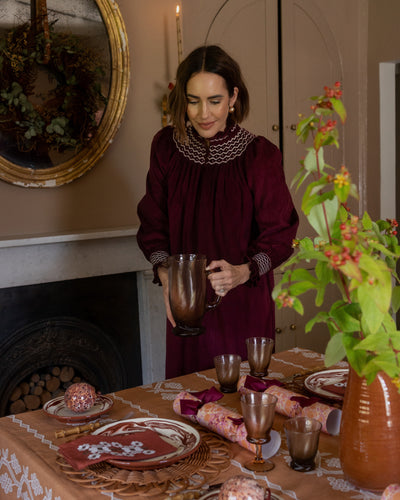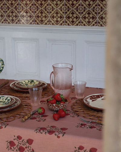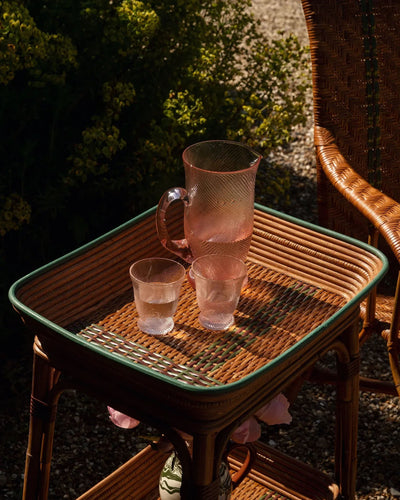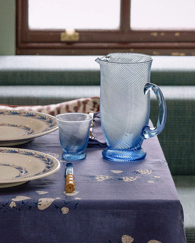 An elegant statement pitcher for the table, the Spiral water jug is handmade and comes in three colourways: Pink, Light blue and Chestnut brown. Also available, matching tumblers and wine glasses.