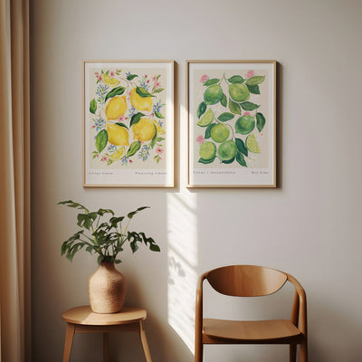 Key Lime Art Print. Part of the fruity floral collection, these vintage botanical style fruit prints are perfect for a kitchen or dining space. Originally hand painted with gouache to capture the botanical essence of these sweet floral fruit.  This print comes Unframed, frames used for styling purposes.