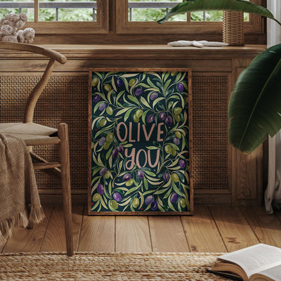 Say Olive You with this sweet olive print on a deep navy background. Originally hand painted by Ellie Mae