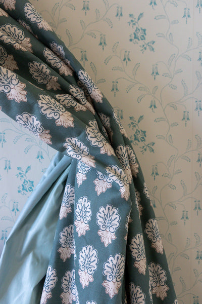 This motif is taken from a wooden Georgian plaster-cast mould; we've repeated it here with reassuring regularity so it appears like a traditional block print.  Its a very pretty small scale pattern and this is the Pine Green colourway.