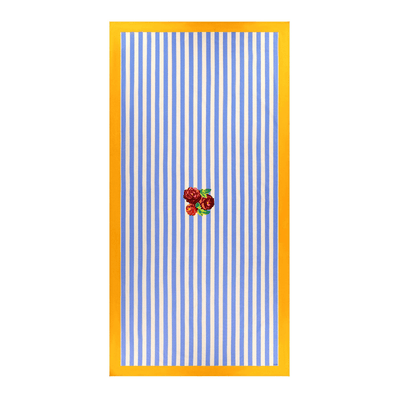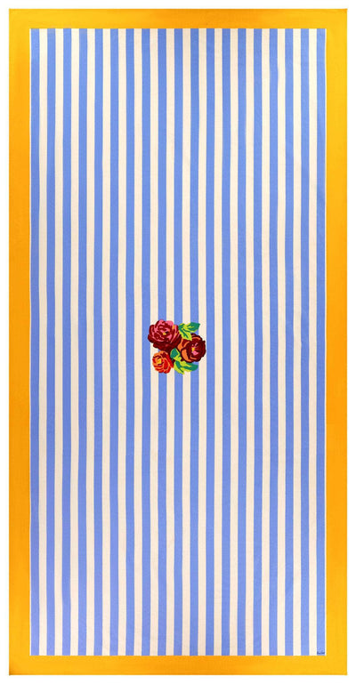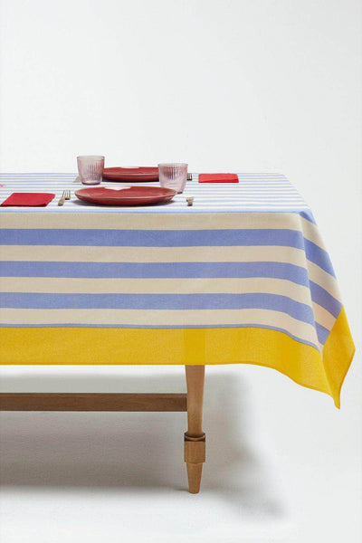 Cotton Cloth 180x350cm  Meticulously handcrafted in India using the artisinal technique of blockprinting, charming imperfections make each and every Lisa Corti mezzero unique Lisa Corti has joined forces with Spanish design duo Blanca Miro and Maria de la Orden of La Veste to create a unique, sunshine-infused textile collection set to enlighten the home all year round. Reimagining the Lisa Corri iconic Nizam Stripes, the joint venture of the two atelier's ethos runs into the La Veste X Lisa Corti pieces. The Nizam Stripes in Sun Yellow are crafted in India. This screen-printed collection features the Nizam flower, reminiscent of French Aubusson carpets, set against light blue and cream stripes inspired by Persian miniatures. This piece, bordered in natural blue, exudes unique, subtle charm.