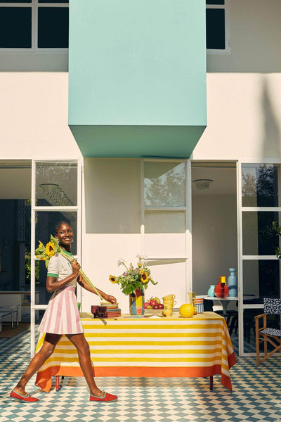 True to Italian tradition, mezzeri are cotton cloths that can be used both decoratively and practically throughout your home and outdoor spaces. Offering an infinity of uses, this generous 8 to 10 seater size makes the perfect setting for a magical dinner party or family picnic, an airy queen size bedspread or colorful cover for your favourite sofa. Cotton Cloth 180x350cm Meticulously handcrafted in India using the artisinal technique of blockprinting, charming imperfections make each and every Lisa Corti mezzero unique Lisa Corti has joined forces with Spanish design duo Blanca Miro and Maria de la Orden of La Veste to create a unique, sunshine-infused textile collection set to enlighten the home all year round. Reimagining the Lisa Corri iconic Nizam Stripes, the joint venture of the two atelier's ethos runs into the La Veste X Lisa Corti pieces. The Nizam Stripes in Sun Yellow are crafted in India. This screen-printed collection features the Nizam flower, reminiscent of French Aubusson carpets, set against light blue and cream stripes inspired by Persian miniatures. This piece, bordered in natural blue, exudes unique, subtle charm.