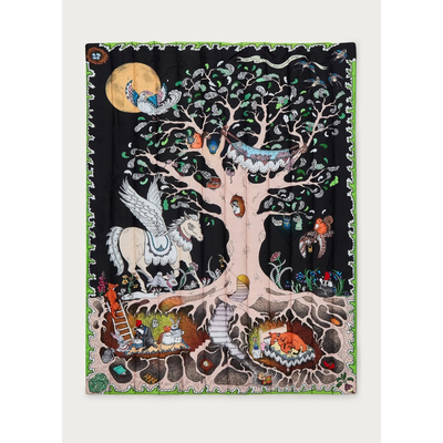 This soft organic cotton Enchanted Forest Quilted Blanket carries children on a magical journey from day to night. These beautifully illustrated woodland scenes bring the forest to life, with friendly daytime wildlife transforming into the mythical creatures of dreams on the reverse. Simply turn the blanket over to discover an enchanting nighttime world, complete with a hidden labyrinth of burrows beneath an ancient oak tree and Frederico the Pegasus, whose wings gently glow in the dark.
