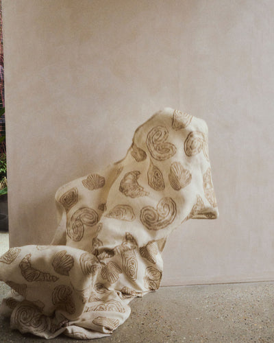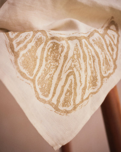 Sunday morning fabric. Hand block printed in London. Featuring delectable Croissants, Pain au chocolats, Palmiers and Madeleines and using Ivory European linen and gold water based textile ink. Block printed in Nic’s London studio. Perfect for curtains and soft furnishing.