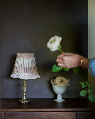 A cotton lampshade defined by three elements: its demure Old Rose colouring that’s feminine and whisper-soft; its wide horizontal stripe design that brings understated pattern to a room; and its neat frilly trim.Being lined in white organic cotton adds a pleasing weight and means the light diffuses through the layers of fabric in a mellow, ambient way.