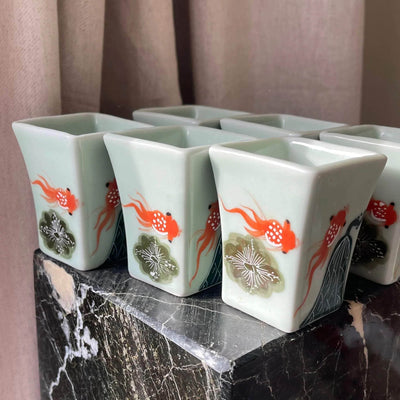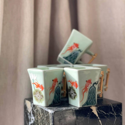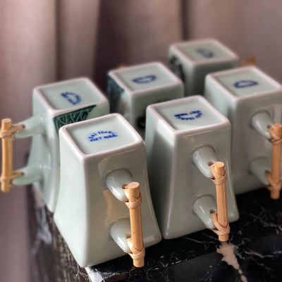 A set of 6 light blue Vietnamese ceramic espresso square cups with Goldfish design and bamboo handles.