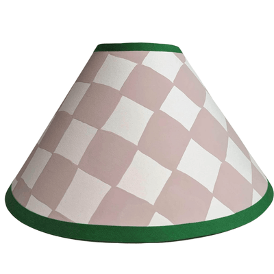 A beautiful pair of handmade paper coolie lampshades with hand painted plaster pink checks and emerald green cotton binding.