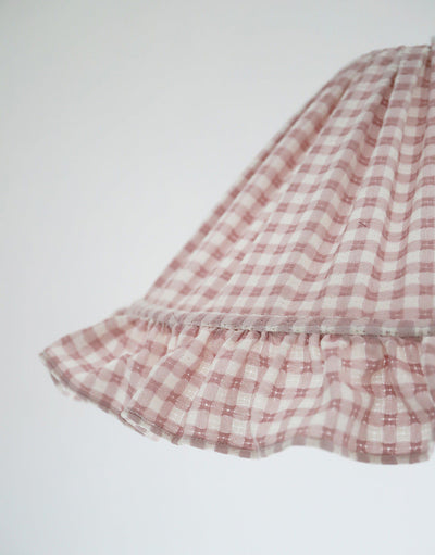 This delicate pendant light features a conical shade covered in a cotton fabric woven with small checks in soft pale pink and off-white, finished with a charming ruffle. The material diffuses a gentle, enveloping light, combining timeless charm with a touch of modernity. Perfect for a dining room, bedroom, or relaxing corner, it creates a refined and original atmosphere.