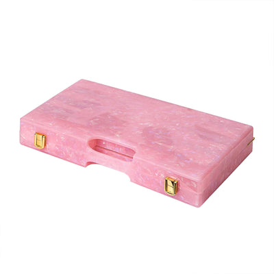 Our Miami backgammon set is the perfect companion for your next sunny getaway. In a background of creamy pink acrylic and a sun motif this set will be the perfect accessory for all Miami lovers.
