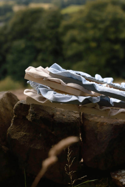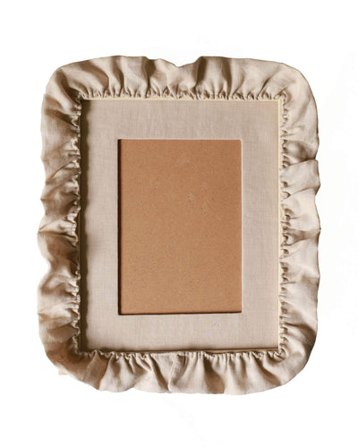A delicate oat linen ruffle adorning an oat stained frame.