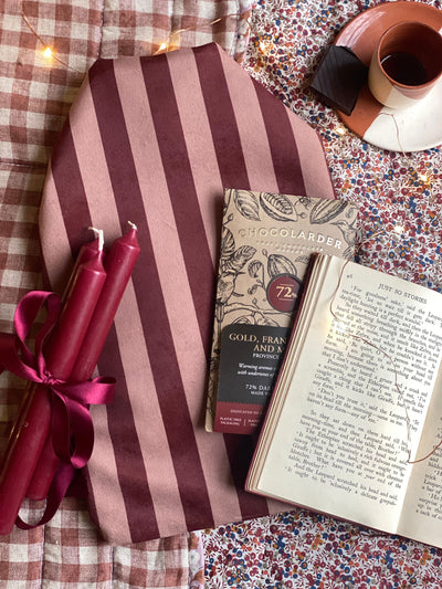Poppy and Honesty have made a limited number of hot water bottle covers in this gorgeous red and pink stripe velvet ‘Bougie’ This luxurious cover has an envelope opening at the back so that you can refill your bottle. The velvet is thick and sumptuous providing cosy comfort for a cold winter’s evening.