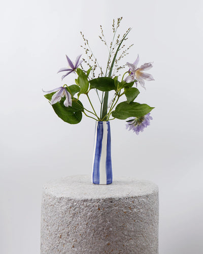 A special hand moulded stem vase, with Aegean blue vertical stripes. Each and every vase is squashed with ♡ and painted by hand in Greece. No two will ever be the same.